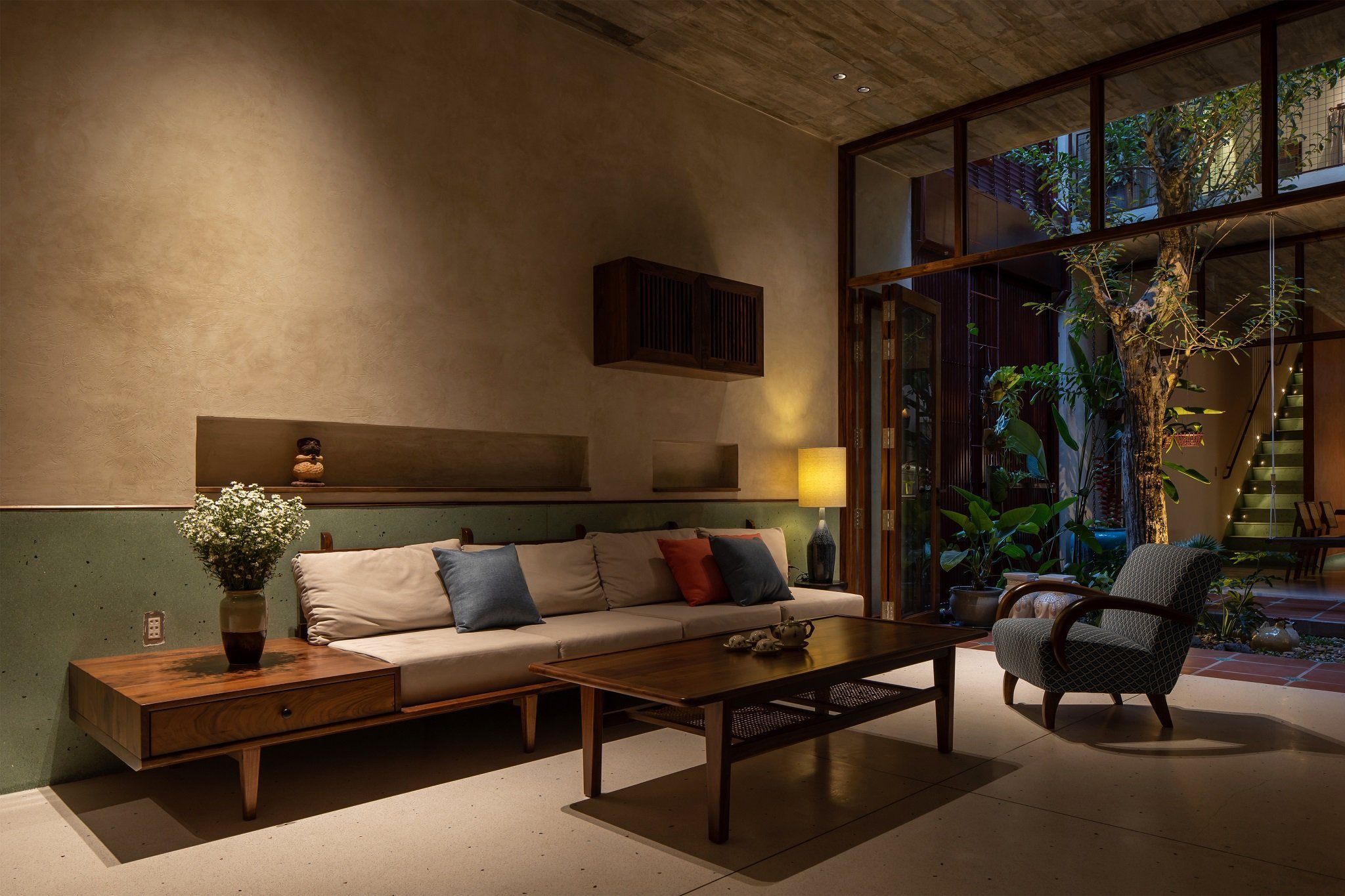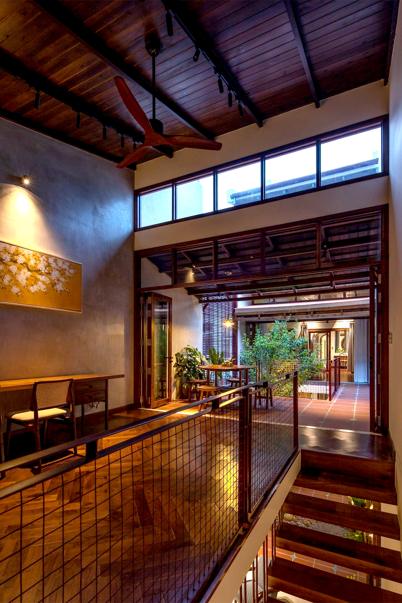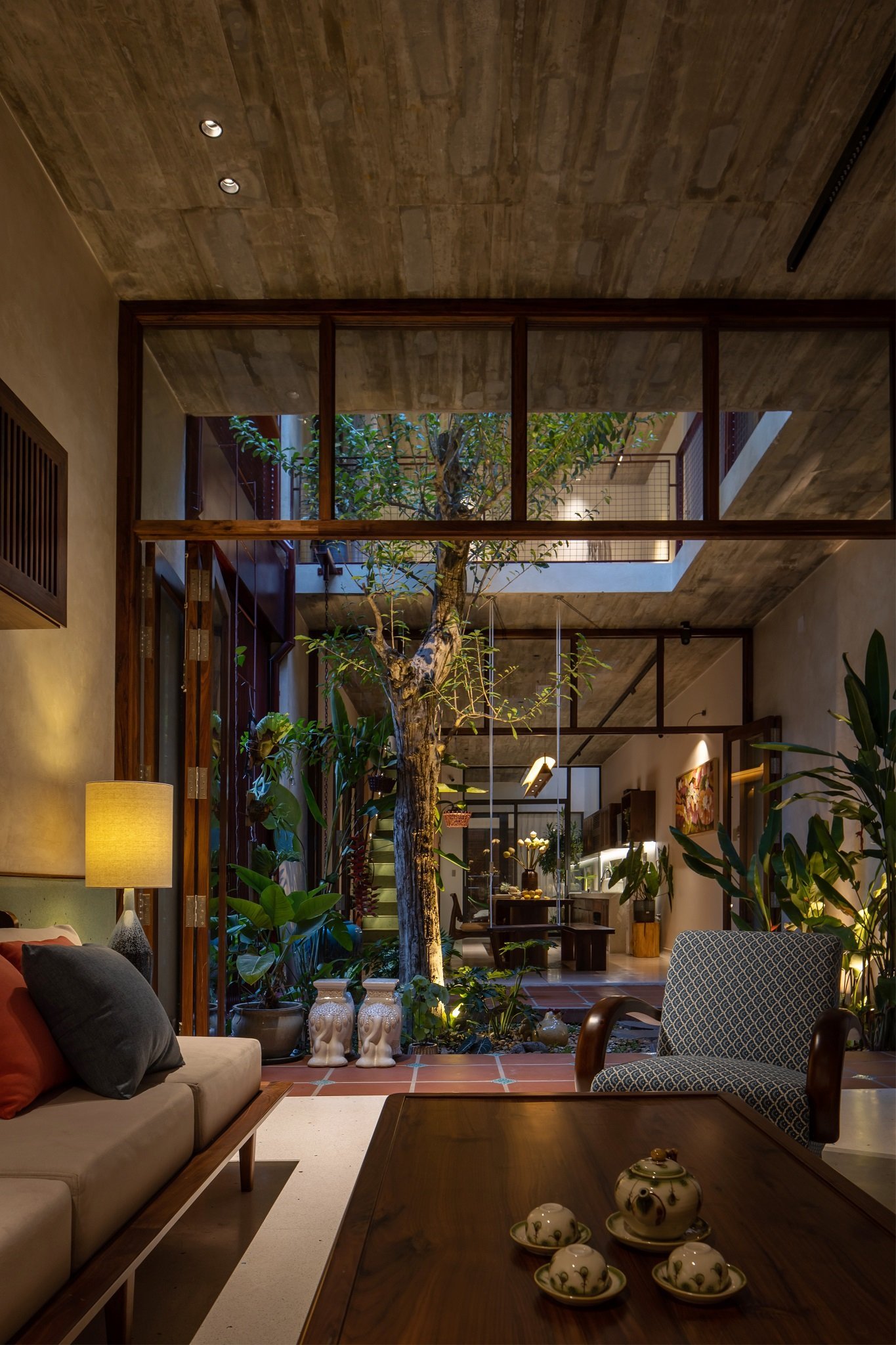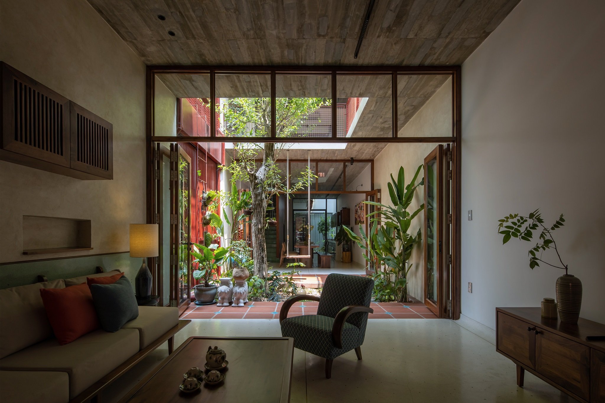 Ngôi nhà hướng Đông Nam, với chiều dài của khu đất được coi là một lợi thế. Việc tổ chức các không gian được sắp xếp theo thứ tự: không gian buôn bán, sân trong, phòng khách, bàn ăn, bếp, sân phụ, và phòng ngủ. Không gian thờ cúng, phòng học tập và các phòng ngủ khác nằm ở các tầng lầu 1 và 2, được bố trí theo trình tự từ ngoài vào trong. Trong phong cách thiết kế xu hướng truyển thống của nhà ở miền Tây Nam Bộ, Mỗi khu vực bố trí từ nội thất đến không gian đều phản ánh lên cá tính riêng cùng khái niệm về cách sống của gia chủ. Yếu tố linh hoạt và cộng đồng trong ngôi nhà thể hiện qua các khu vườn nằm giữa các không gian và mái hiên kéo dài từ trong nhà ra ngoài, tạo nên nơi sinh hoạt và trò chuyện với hàng xóm, láng giềng.
