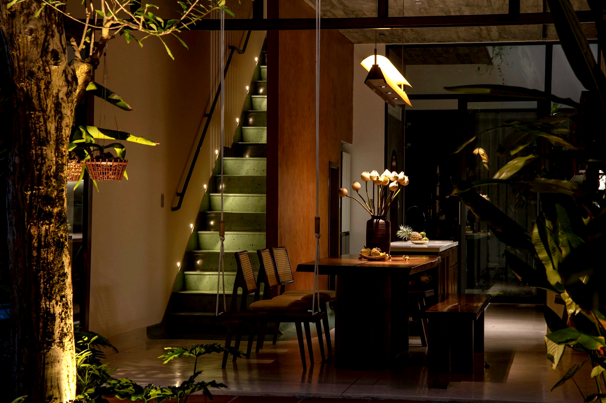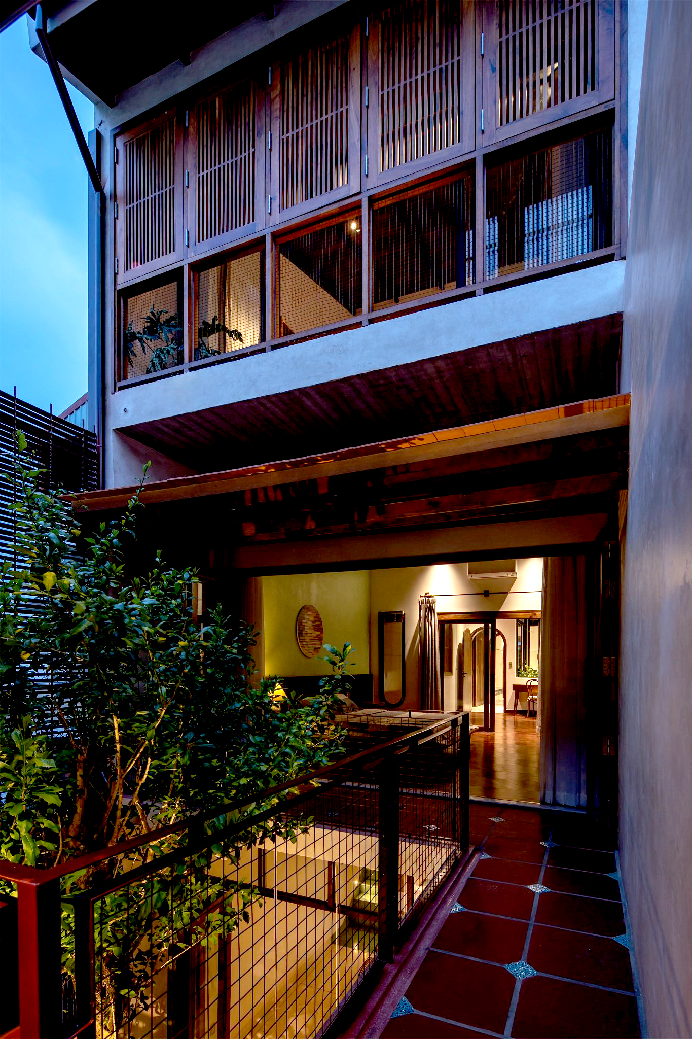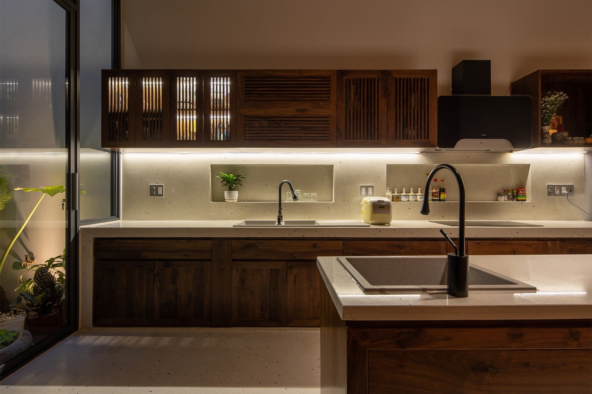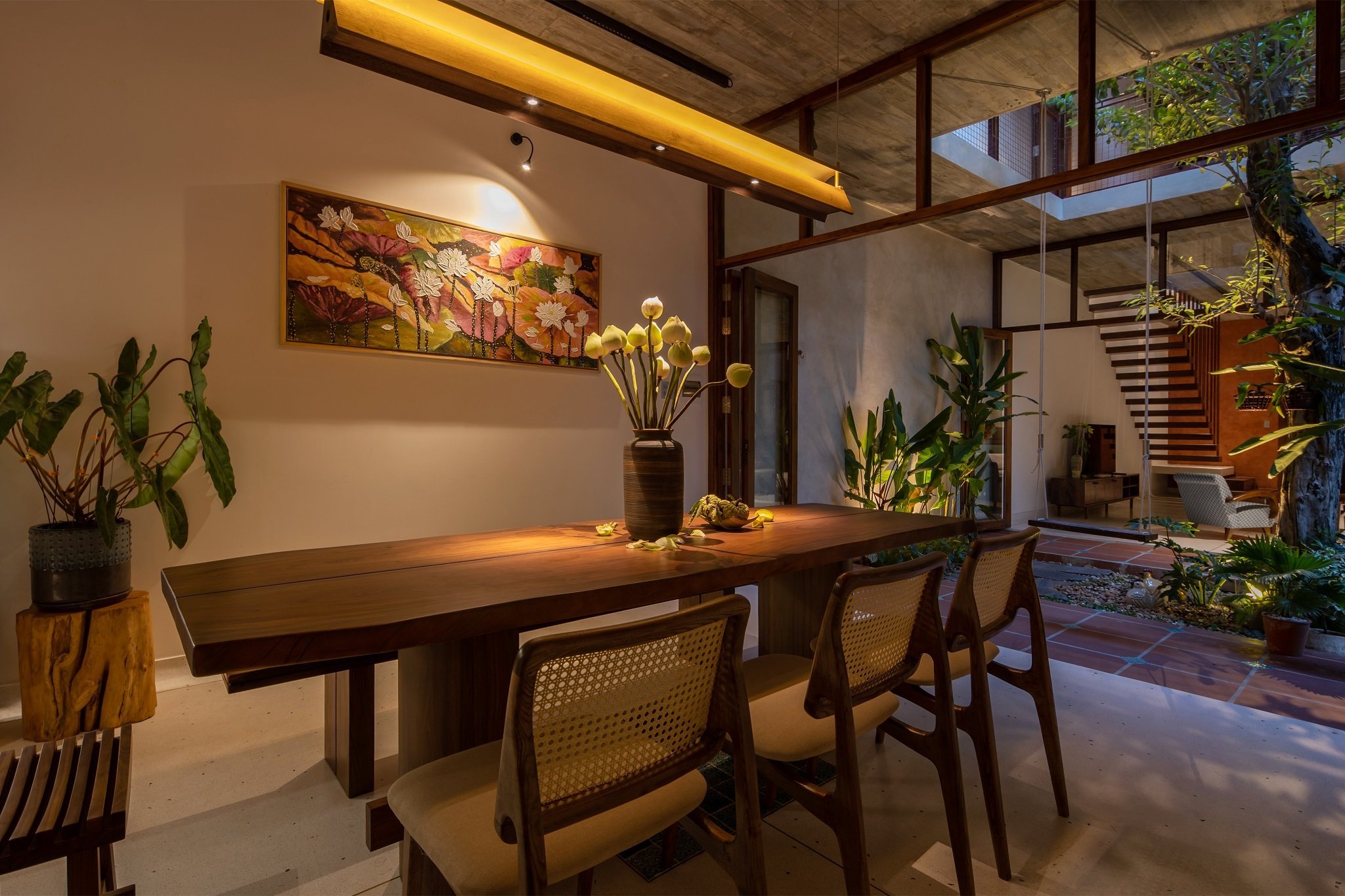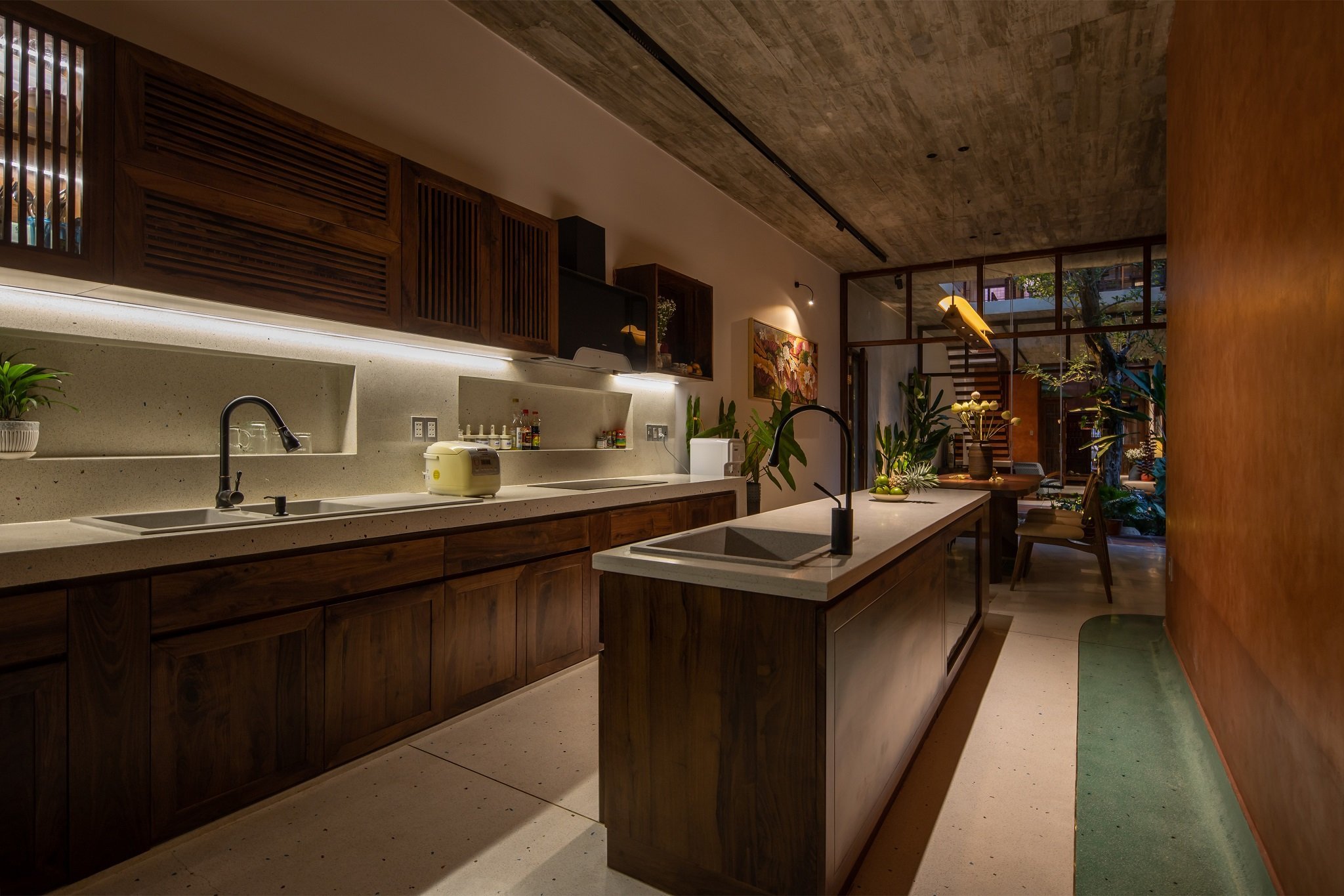 Ngôi nhà hướng Đông Nam, với chiều dài của khu đất được coi là một lợi thế. Việc tổ chức các không gian được sắp xếp theo thứ tự: không gian buôn bán, sân trong, phòng khách, bàn ăn, bếp, sân phụ, và phòng ngủ. Không gian thờ cúng, phòng học tập và các phòng ngủ khác nằm ở các tầng lầu 1 và 2, được bố trí theo trình tự từ ngoài vào trong. Trong phong cách thiết kế xu hướng truyển thống của nhà ở miền Tây Nam Bộ, Mỗi khu vực bố trí từ nội thất đến không gian đều phản ánh lên cá tính riêng cùng khái niệm về cách sống của gia chủ. Yếu tố linh hoạt và cộng đồng trong ngôi nhà thể hiện qua các khu vườn nằm giữa các không gian và mái hiên kéo dài từ trong nhà ra ngoài, tạo nên nơi sinh hoạt và trò chuyện với hàng xóm, láng giềng.