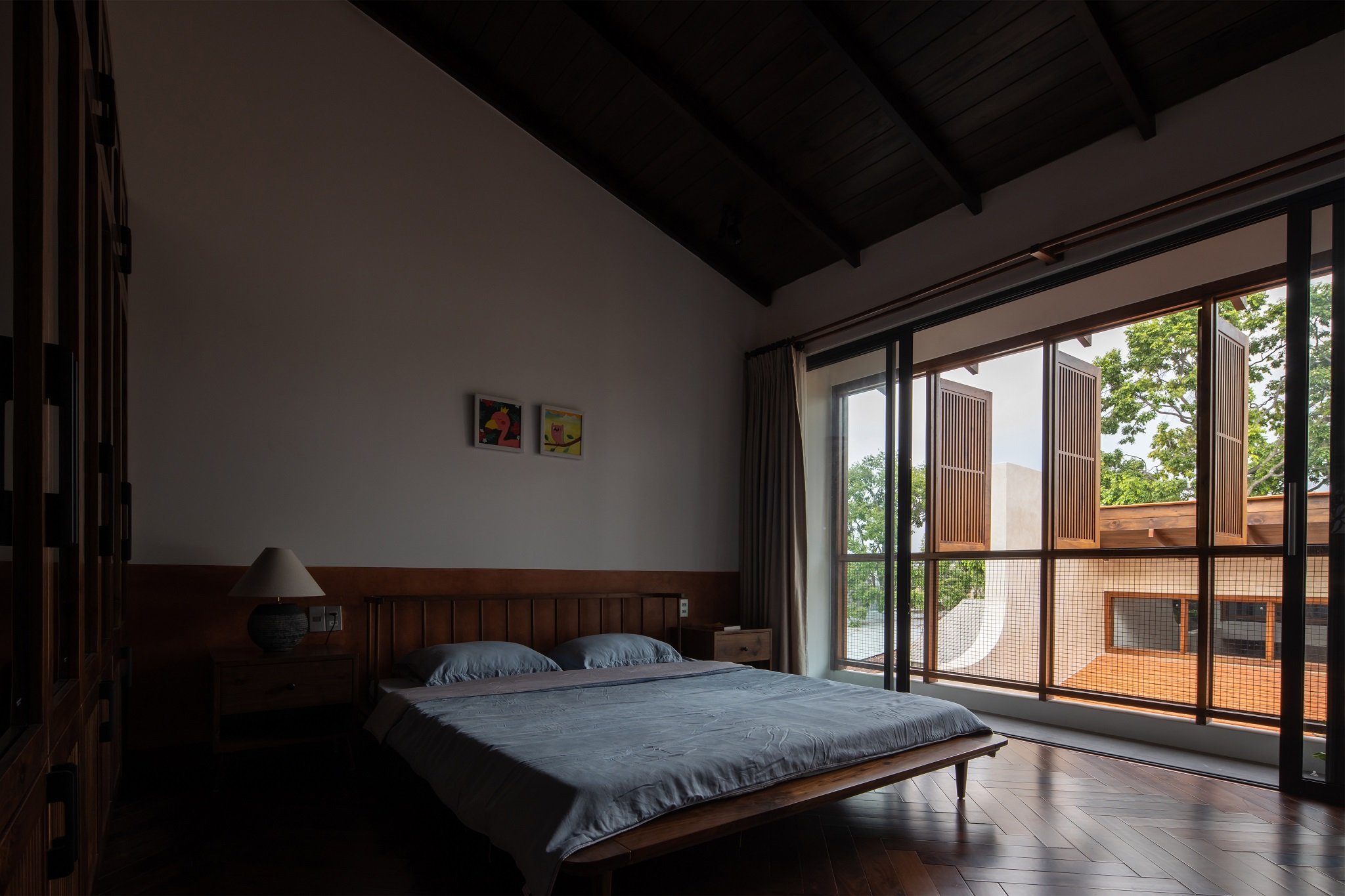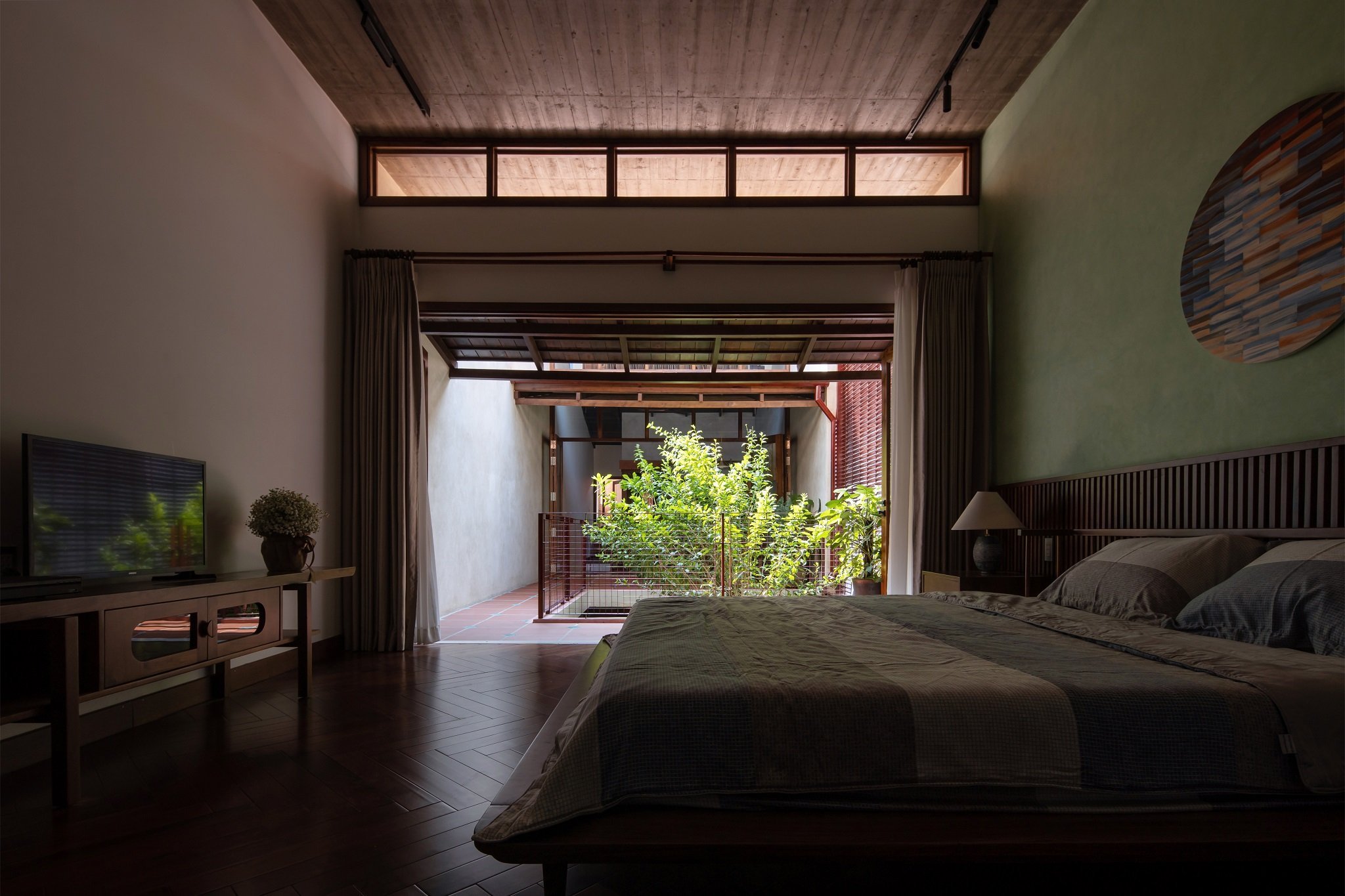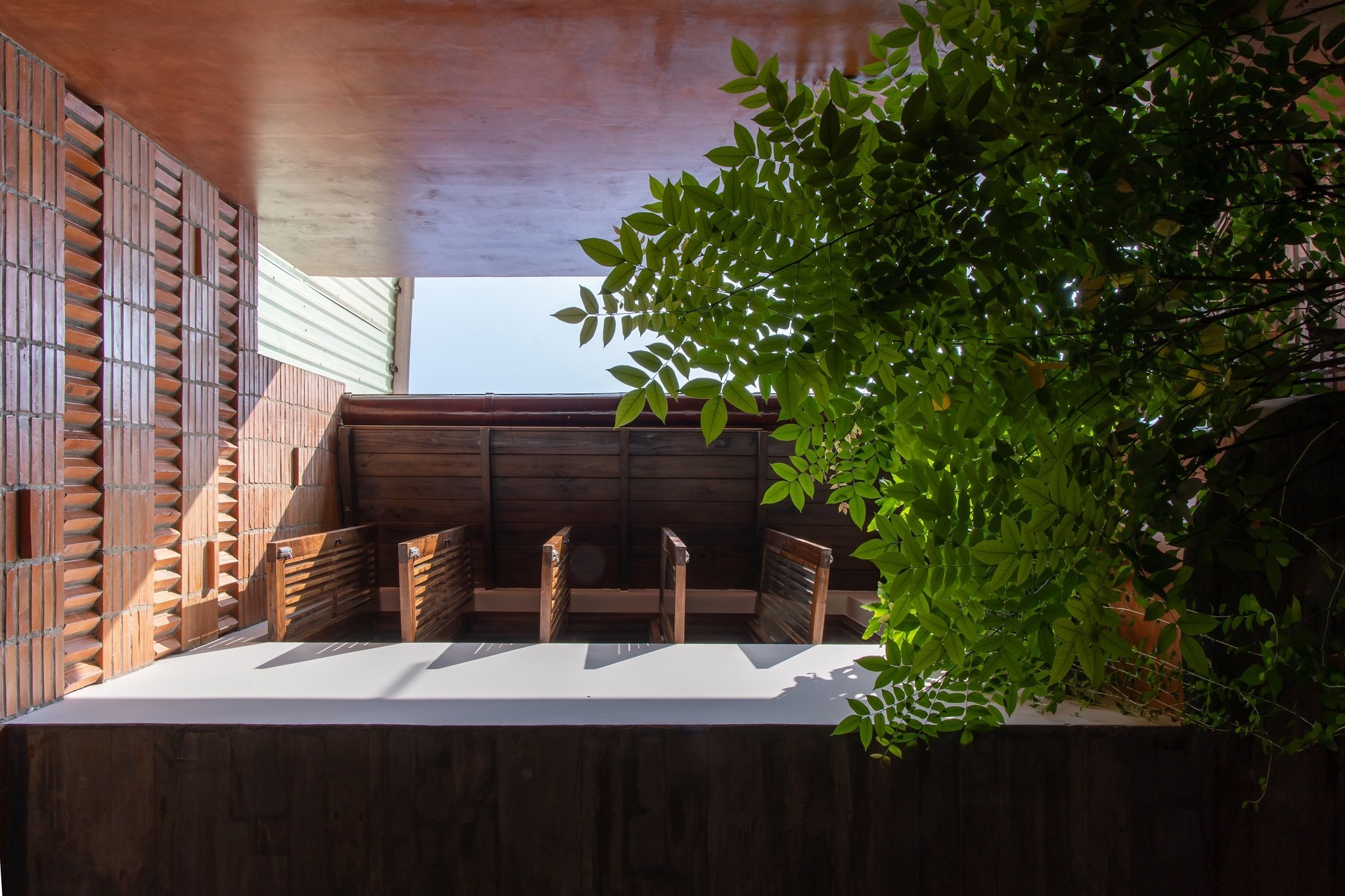 Cấu trúc mái được thiết kế dựa trên tính nhịp điệu, nhìn từ trên cao các gian nhà được tách ra như các ngôi nhà bè trong văn hóa sông nước miền Tây, vừa lênh đênh vừa gắn kết. Các không gian yên tĩnh dần dần lùi sâu, ranh giới phân chia không gian chung chỉ mang tính tương đối. Cách tổ chức này giúp chúng tôi giải quyết vấn đề thông gió xuyên phòng và giảm thiểu tiếng ồn cho các phòng ngủ.