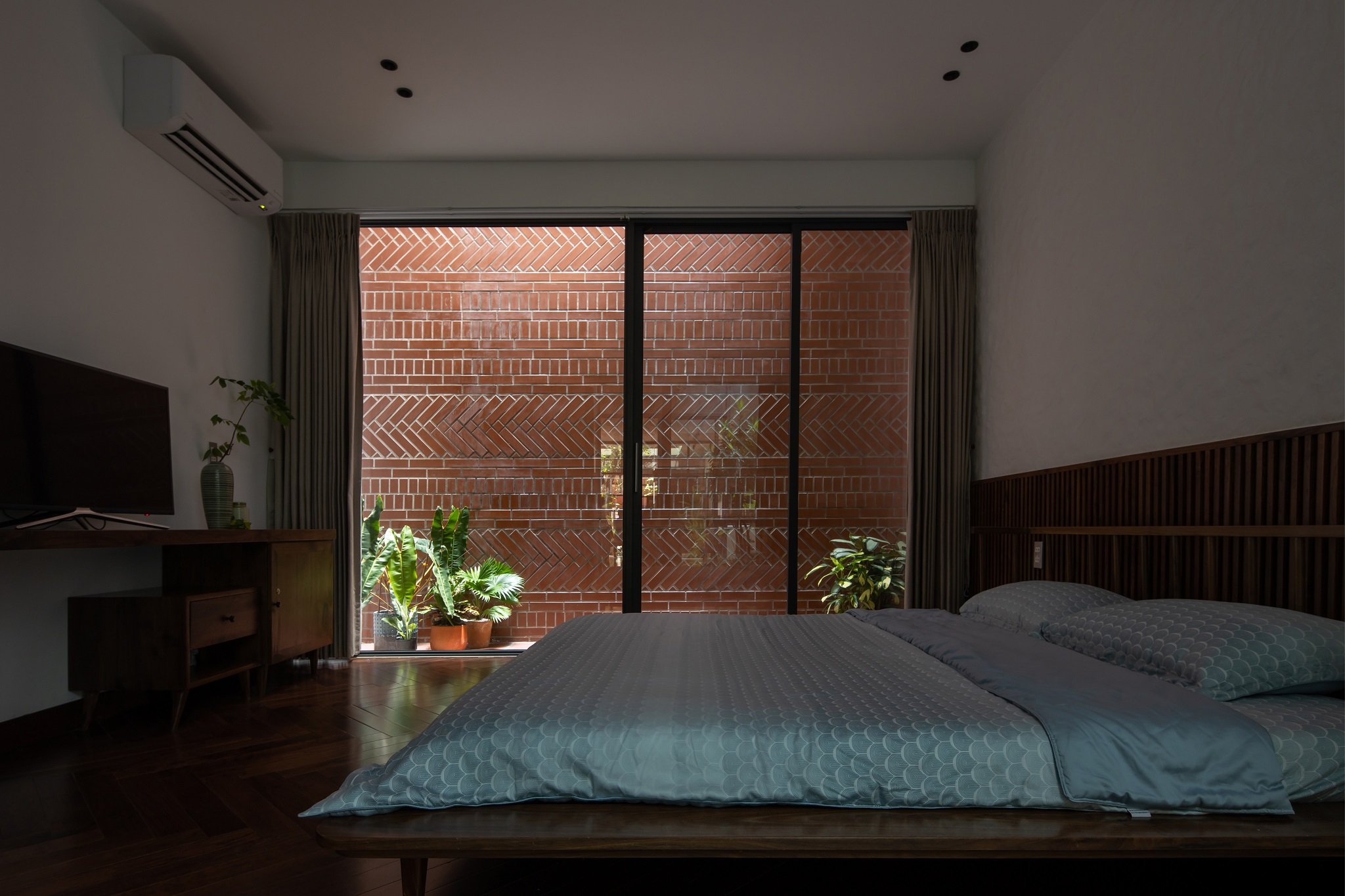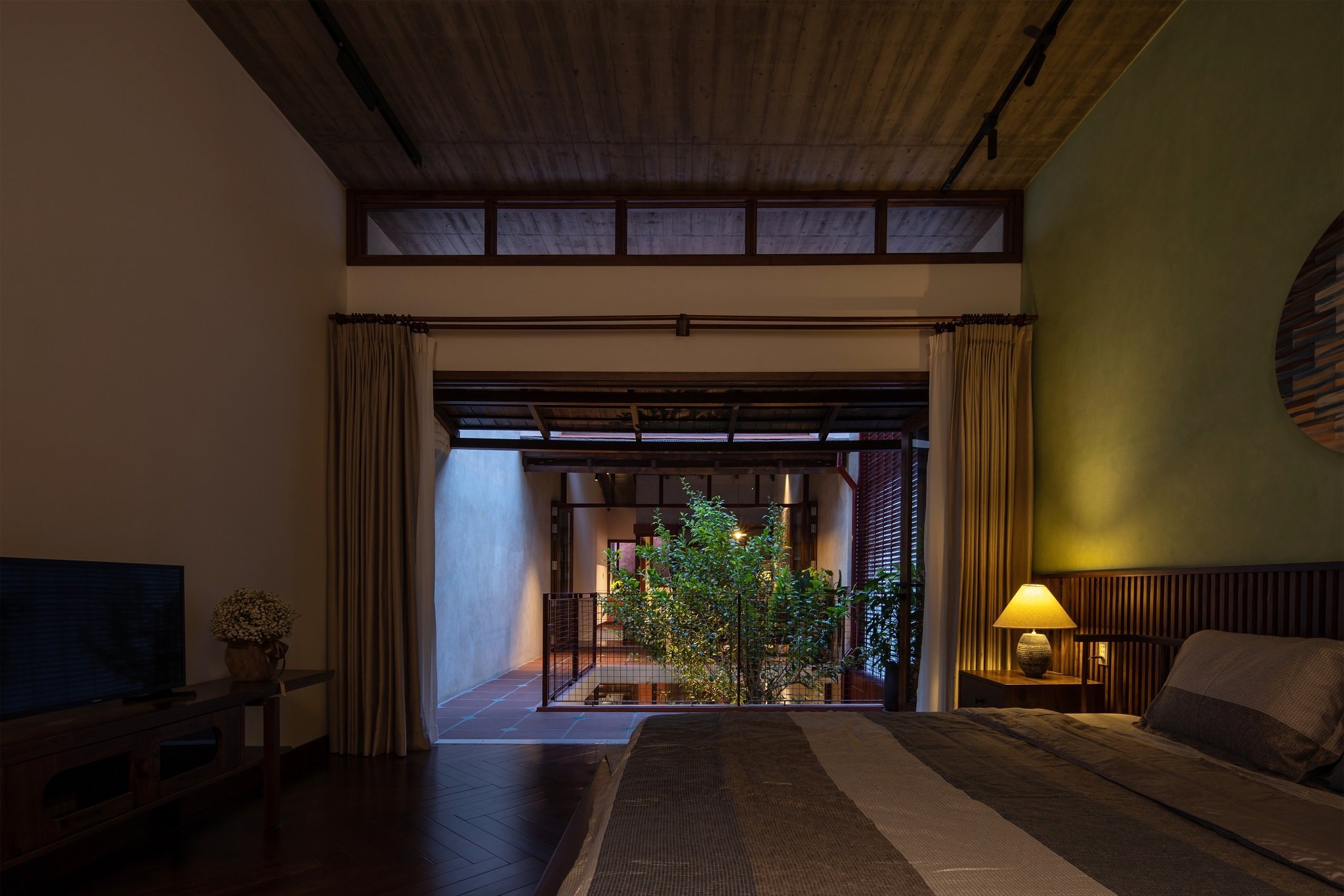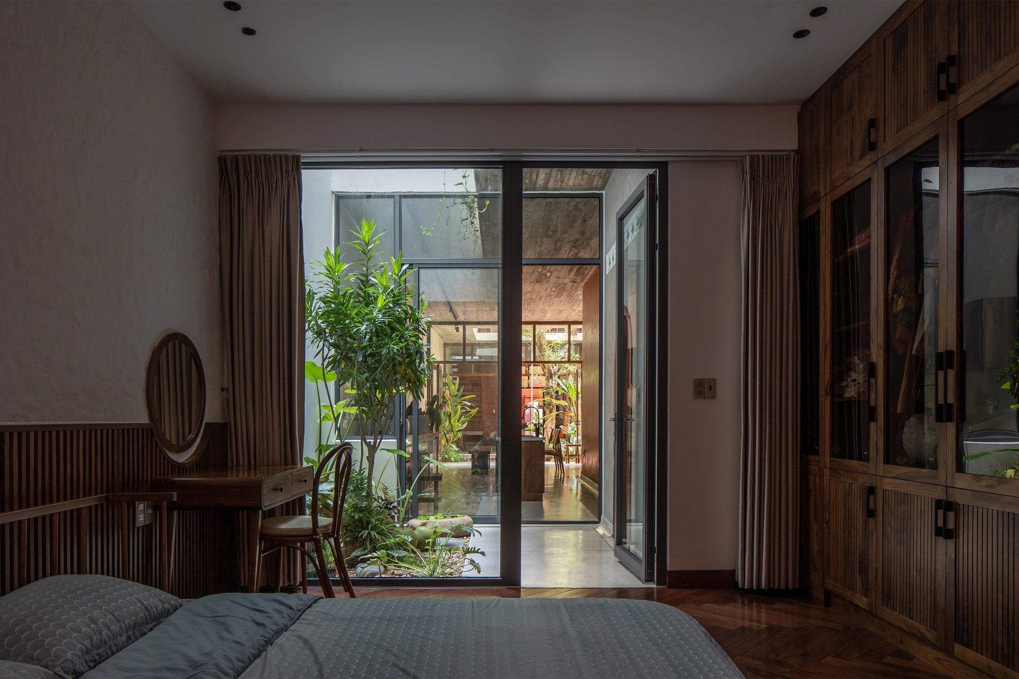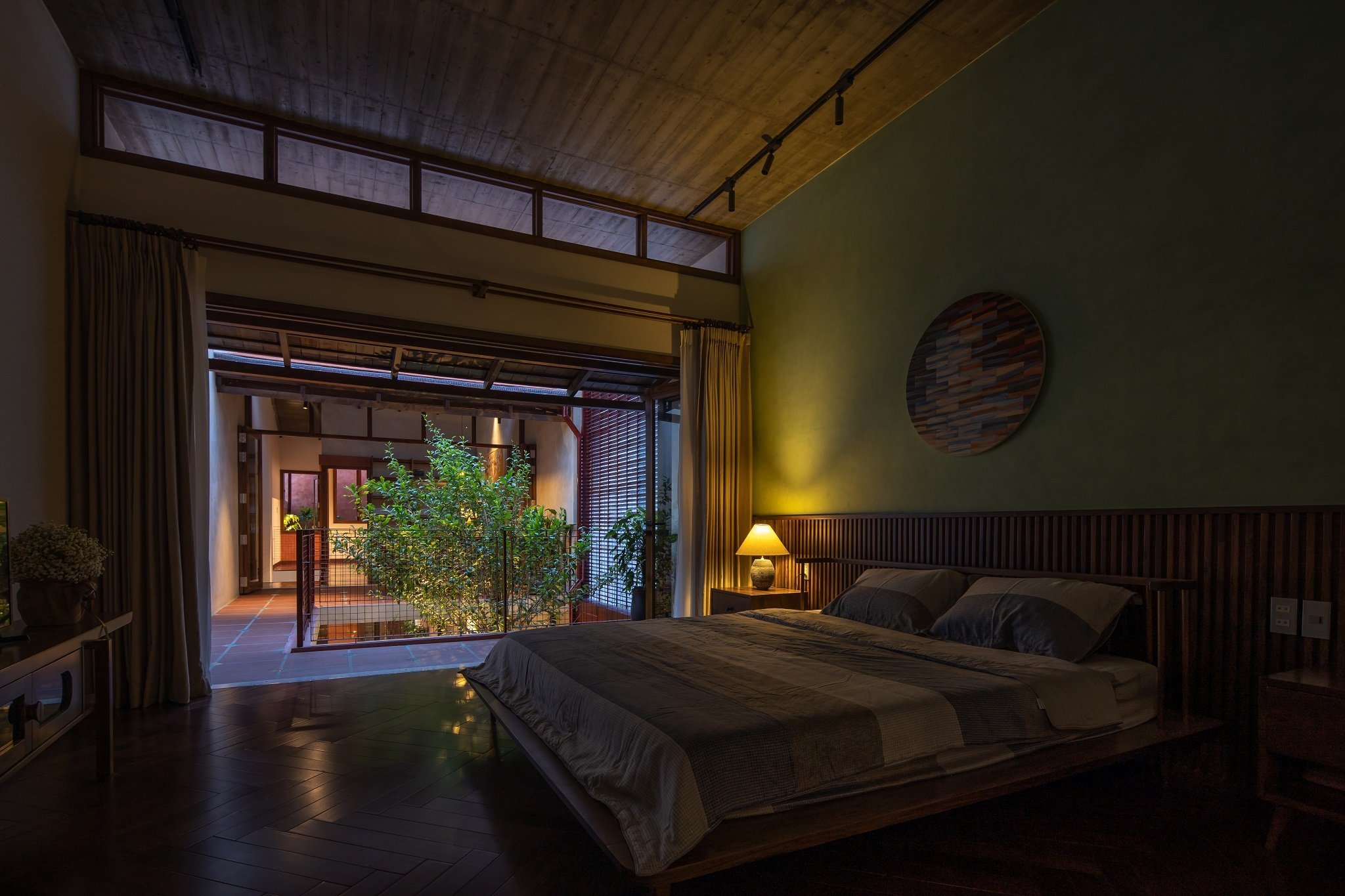Cấu trúc mái được thiết kế dựa trên tính nhịp điệu, nhìn từ trên cao các gian nhà được tách ra như các ngôi nhà bè trong văn hóa sông nước miền Tây, vừa lênh đênh vừa gắn kết. Các không gian yên tĩnh dần dần lùi sâu, ranh giới phân chia không gian chung chỉ mang tính tương đối. Cách tổ chức này giúp chúng tôi giải quyết vấn đề thông gió xuyên phòng và giảm thiểu tiếng ồn cho các phòng ngủ.